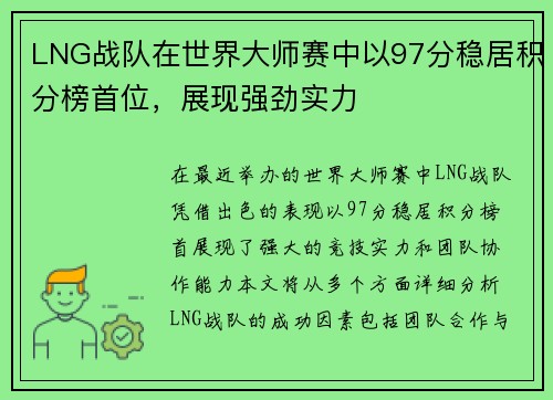 LNG战队在世界大师赛中以97分稳居积分榜首位,展现强劲实力