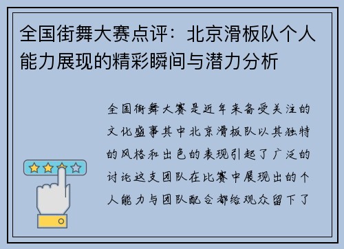 全国街舞大赛点评:北京滑板队个人能力展现的精彩瞬间与潜力分析